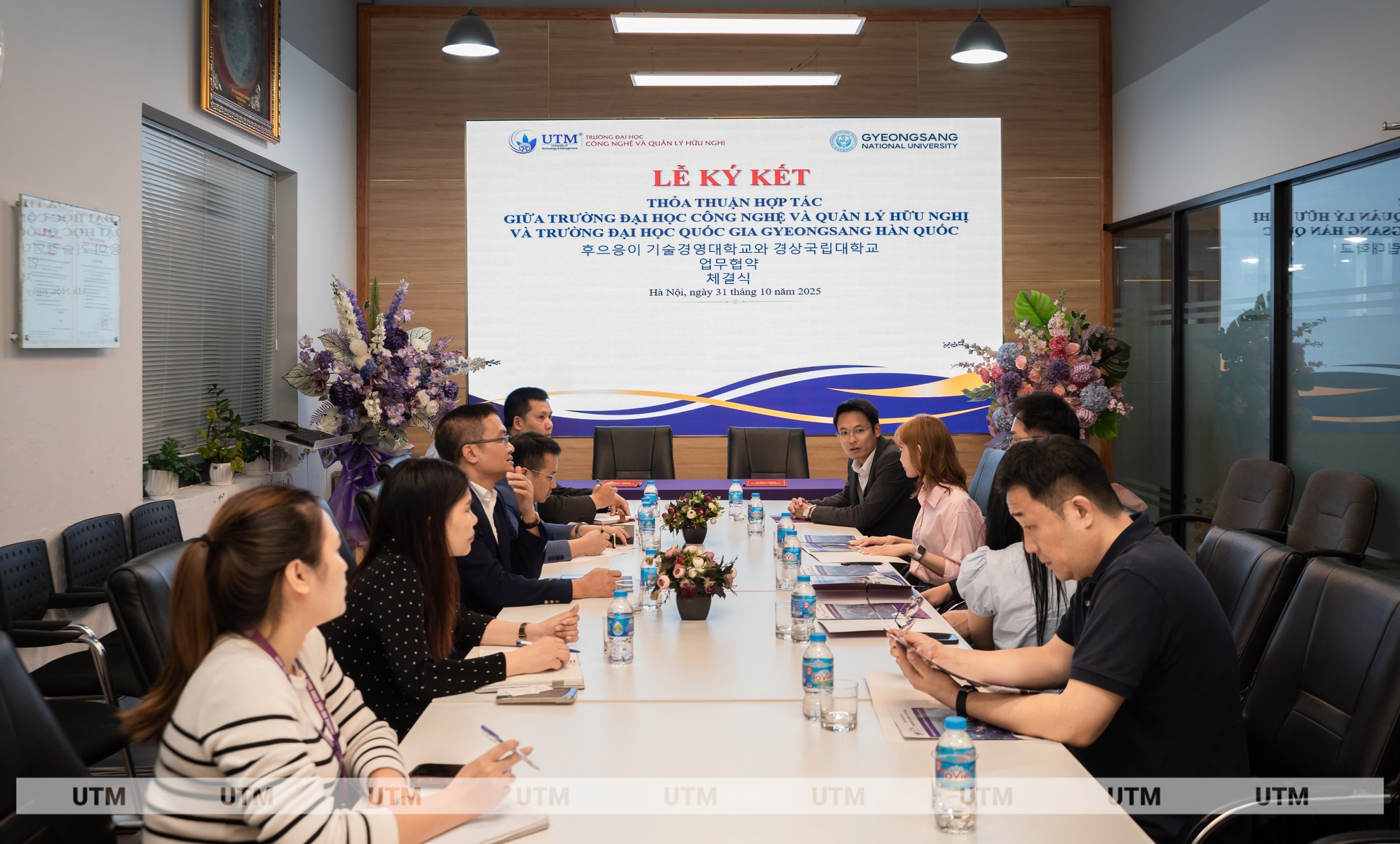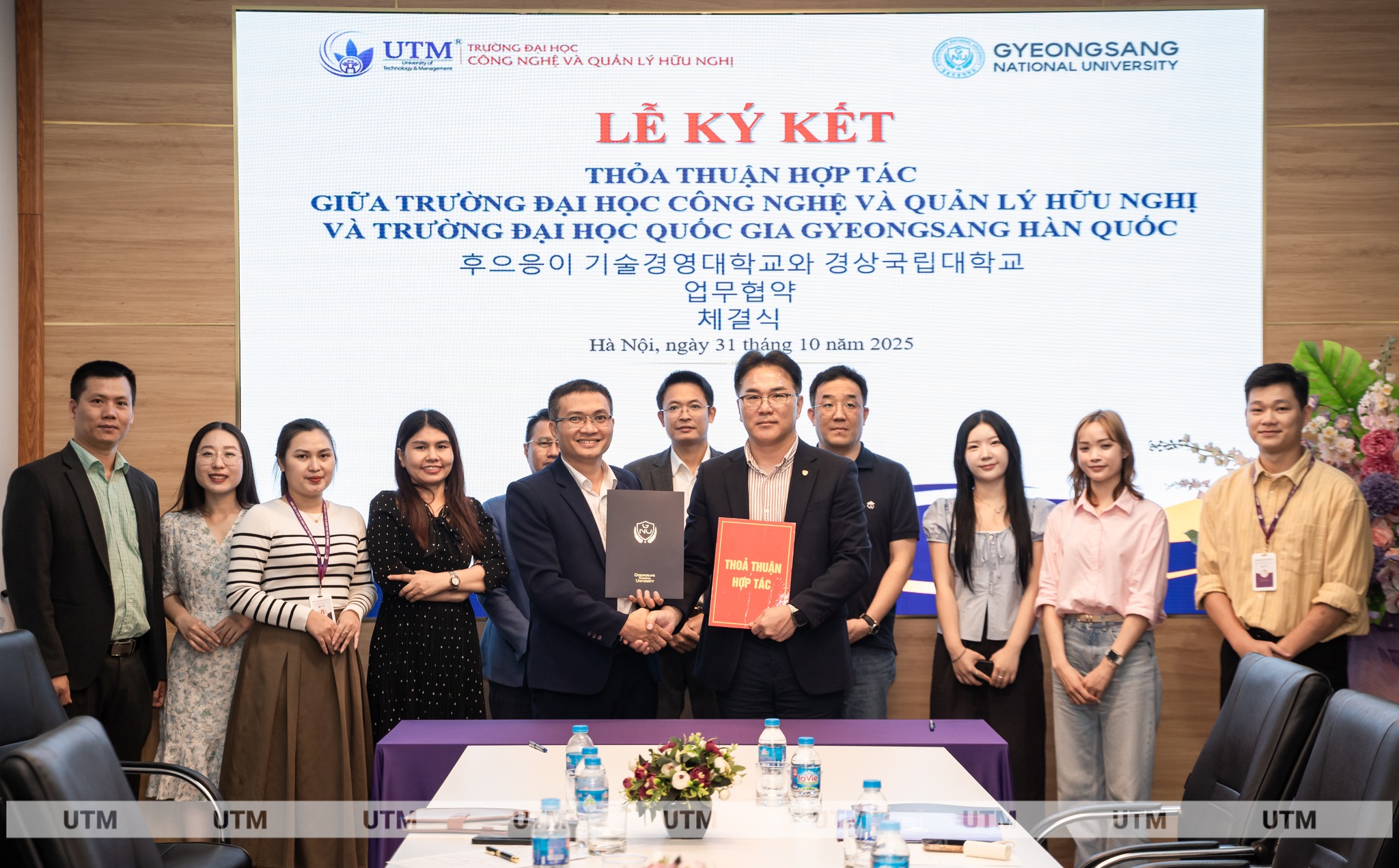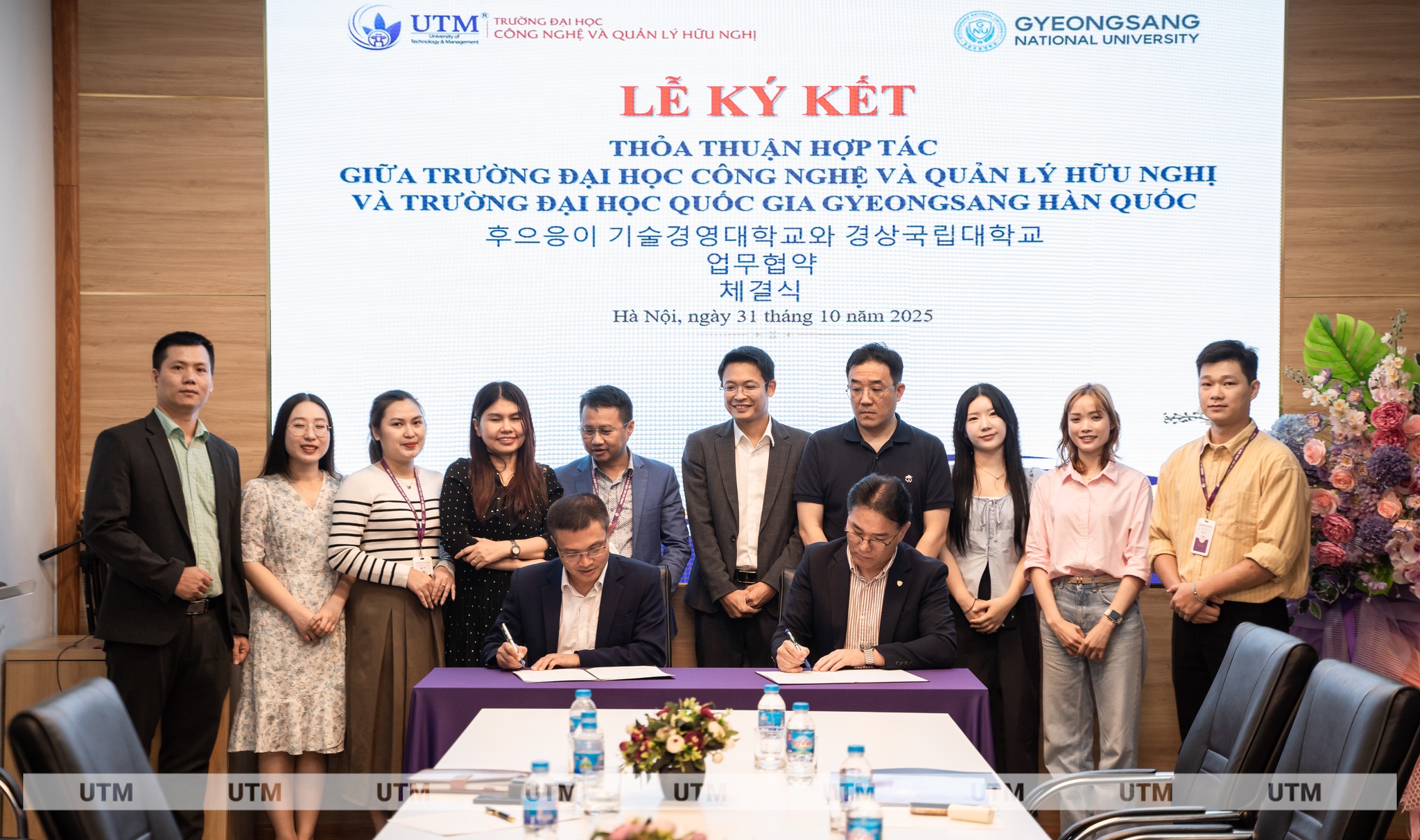 Ngày 31/10/2025, tại Trường Đại học Công nghệ và Quản lý Hữu Nghị (UTM – Hà Nội), lễ ký kết biên bản ghi nhớ hợp tác (MOU) giữa UTM và Trường Đại học Quốc gia Gyeongsang, Hàn Quốc đã diễn ra trang trọng với sự tham dự của lãnh đạo hai bên, giảng viên và sinh viên. Sự kiện đánh dấu bước phát triển mới trong chiến lược quốc tế hóa giáo dục, mở ra nhiều cơ hội học tập, nghiên cứu và giao lưu văn hóa cho sinh viên, giảng viên hai trường.